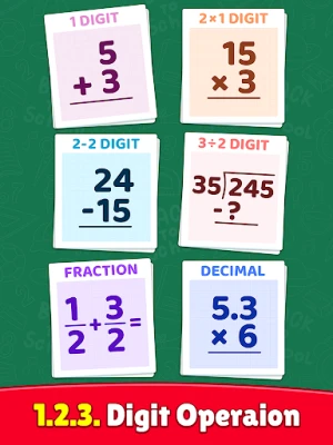 এই শিক্ষামূলক জগতে প্রবেশ করে শিশুরা এক, দুই, বা তিন অঙ্কের যোগফল নির্ণয় করতে শিখবে। একইভাবে, বিয়োগের ক্ষেত্রেও তারা ধাপে ধাপে জটিল সংখ্যা বিয়োগের কৌশল আয়ত্ত করবে। গুণের জটিলতা দূর করতে এখানে রয়েছে এক, দুই এবং তিন অঙ্কের গুণ শেখার সেরা অনুশীলন। ভাগের ধারণা স্পষ্ট করতেও রয়েছে সুস্পষ্ট পাঠ। এছাড়াও, ভগ্নাংশের হিসাব নির্ভুলভাবে শেখার জন্য ধাপে ধাপে নির্দেশিকা দেওয়া হয়েছে এবং দশমিকের যোগ-বিয়োগ শেখার জন্য মজাদার পদ্ধতি ব্যবহার করা হয়েছে।
